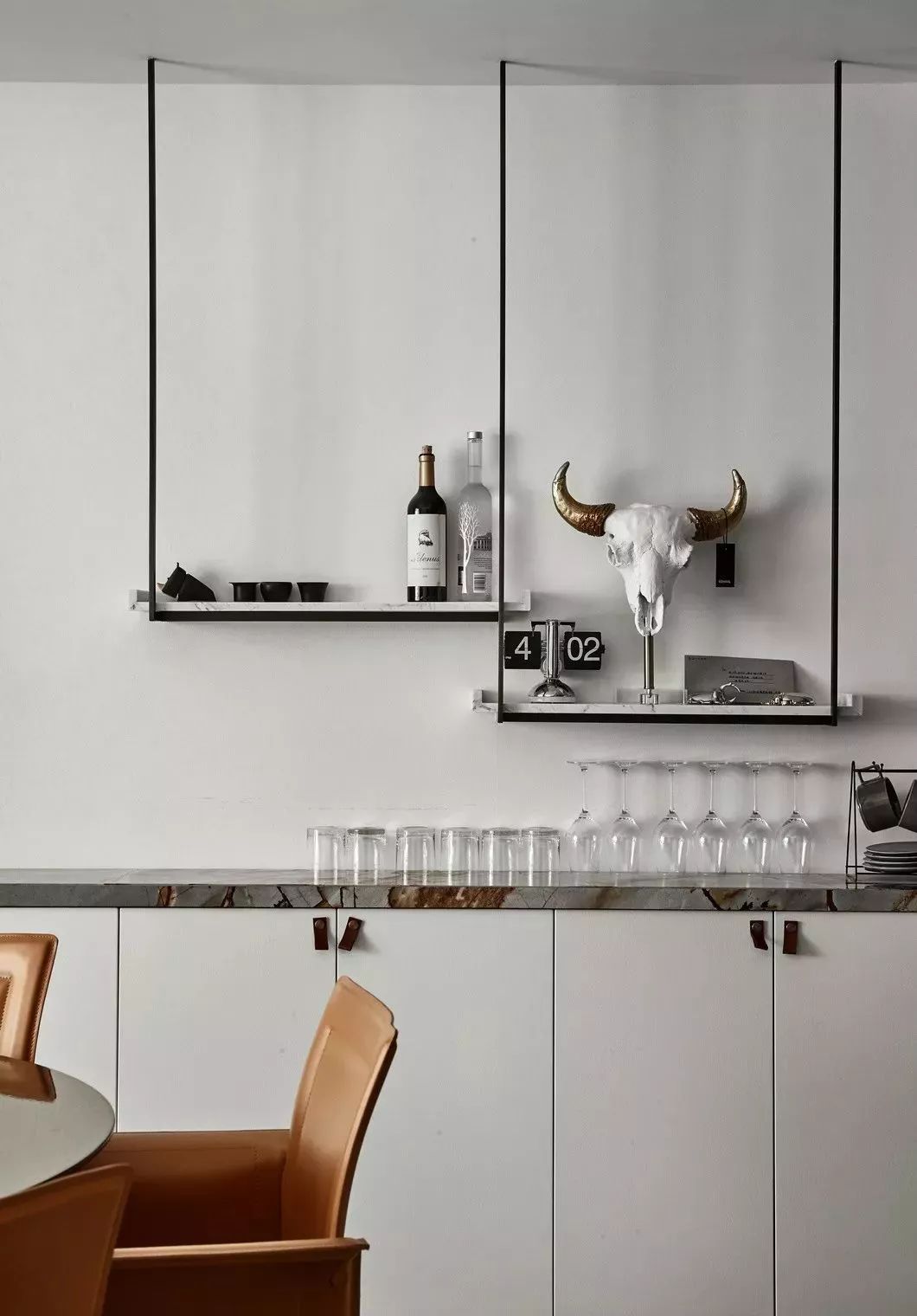 半开放式厨房的备餐台平日里代替了圆型餐桌的功能,但依然会在正餐厅进行视觉性的精心布置。