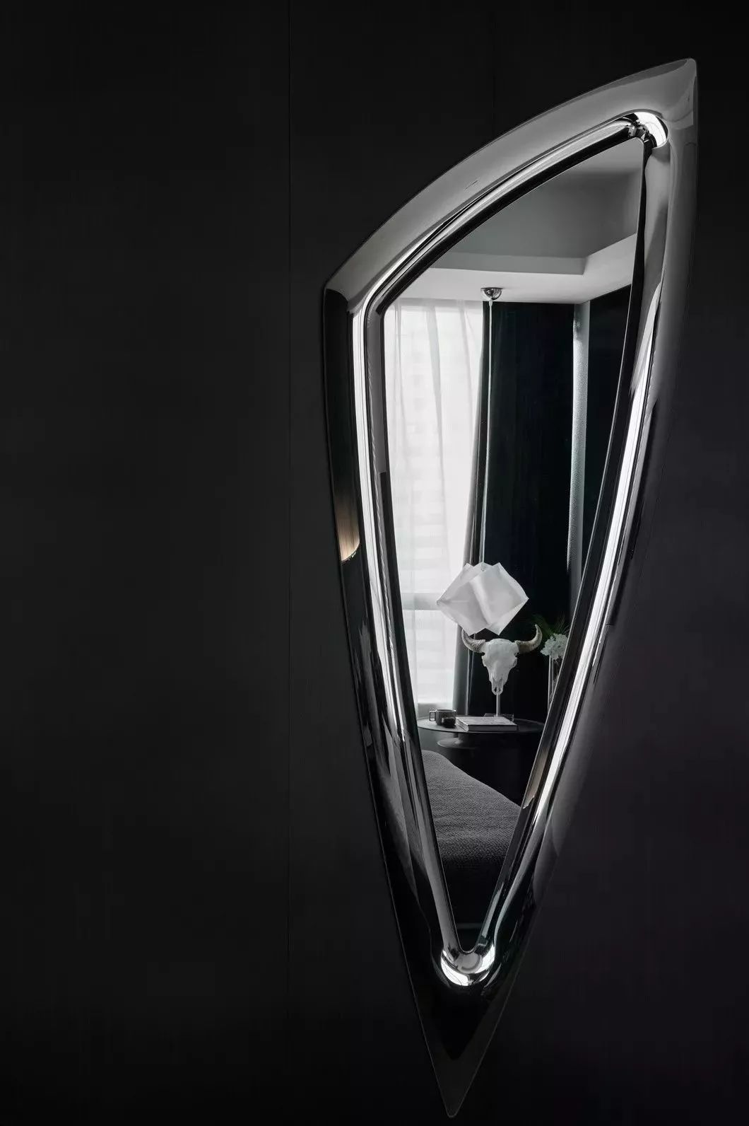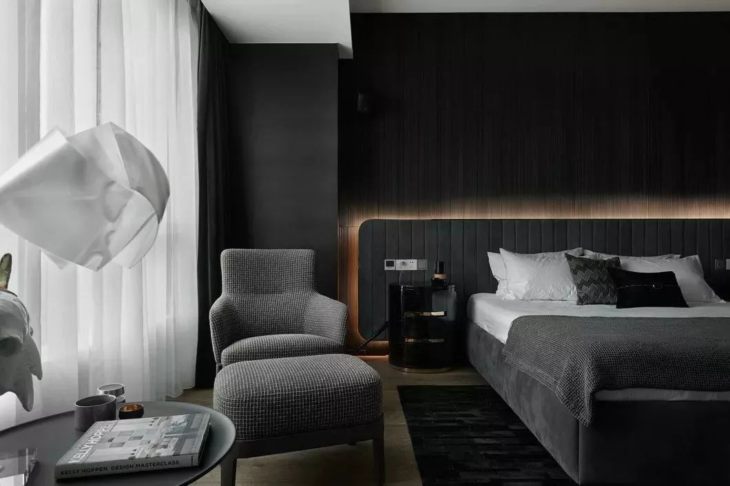 主卧以黑色为背景,加入了男主人惯用的不锈钢、大理石和玻璃材质。