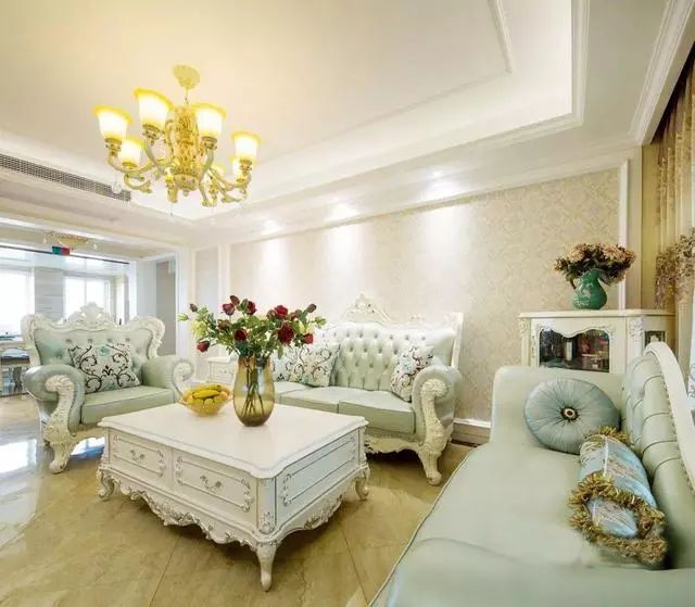 米色大理石地砖配上浅蓝色欧式沙发以及白色欧式茶几以及电视柜,就轻松装饰出一个优雅又大气的客厅。