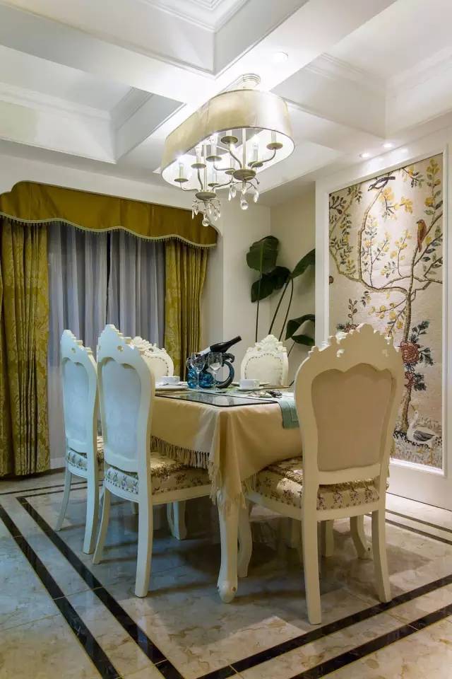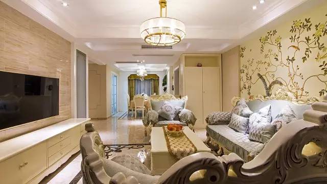 造型别致的吊灯、温暖舒适的沙发、气质沉静的花鸟壁画温情而和谐。