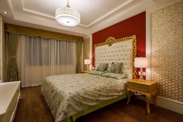 朱红色的布艺硬包和两侧贝壳马赛克的修饰让主卧空间丰富起来,色泽鲜明。