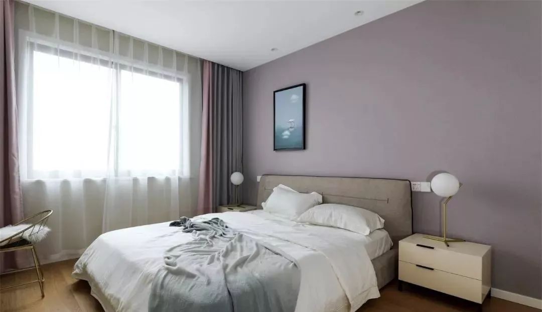 主卧室的背景墙刷成了更为优雅的灰紫色,墙面的挂画和床上的毯子相互呼应,左右两侧的台灯简洁而又精致,床尾还有设计了一个梳妆台。