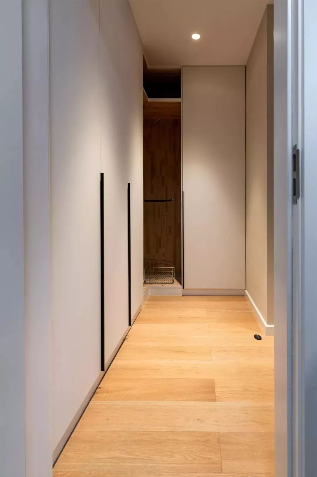 入户的玄关处做了嵌入式的到顶鞋柜,下方和中间留空加上藏光,方便日常使用。鞋柜侧方和电视背景墙连接起来,用木饰板来隐藏了一扇门。