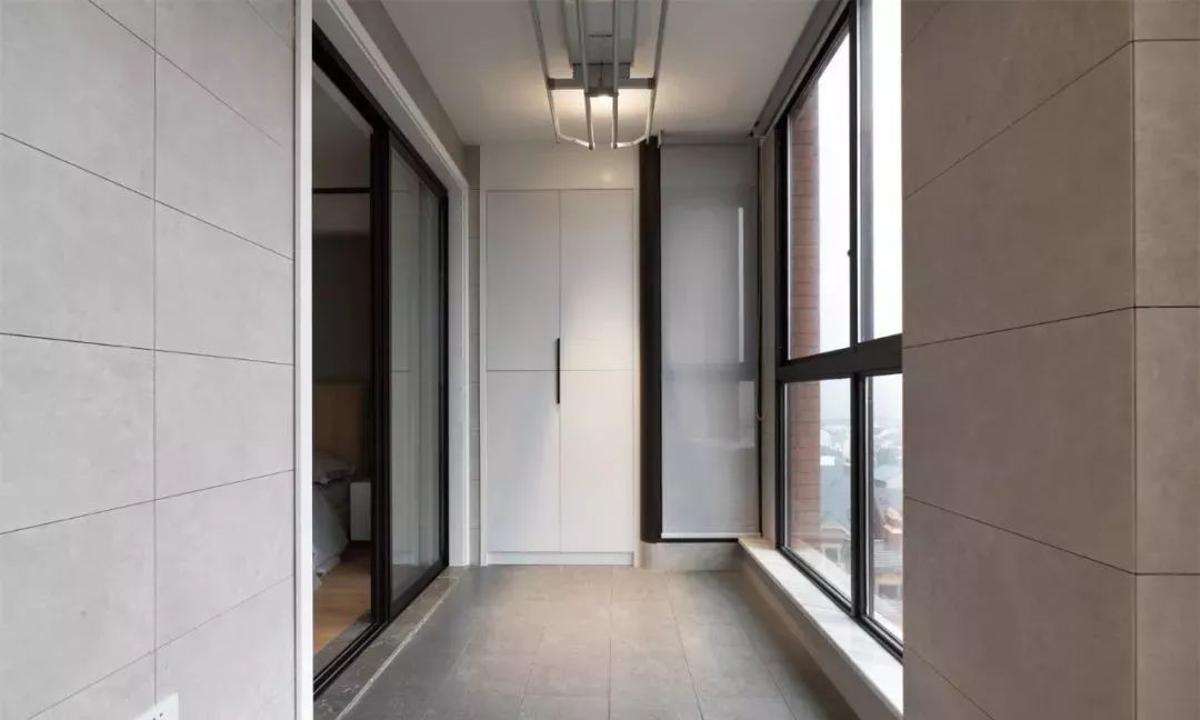 次卧的外面阳台和客厅阳台相连,在侧方做上到顶的柜子,增强家里的储物能力。上方做上升降式的晾衣杆,晾晒衣服更加方便。