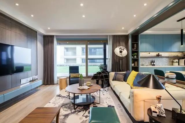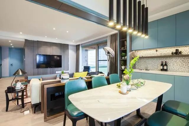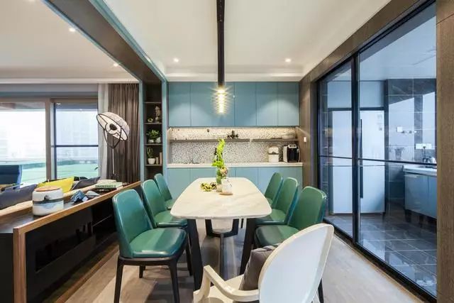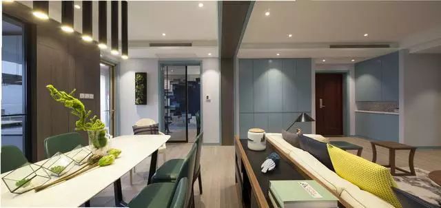 客餐厅区域看向玄关区,入户门背蓝色的鞋柜中间镂空做成上下柜,增加实用性;