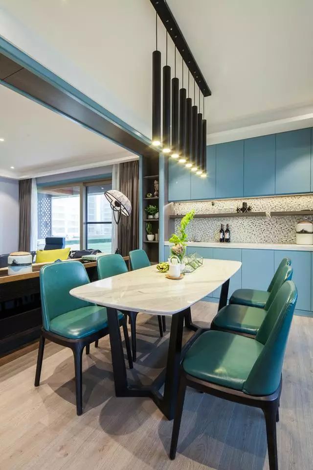 长方形的石材餐桌,黑色的吊灯,线条感超强的。