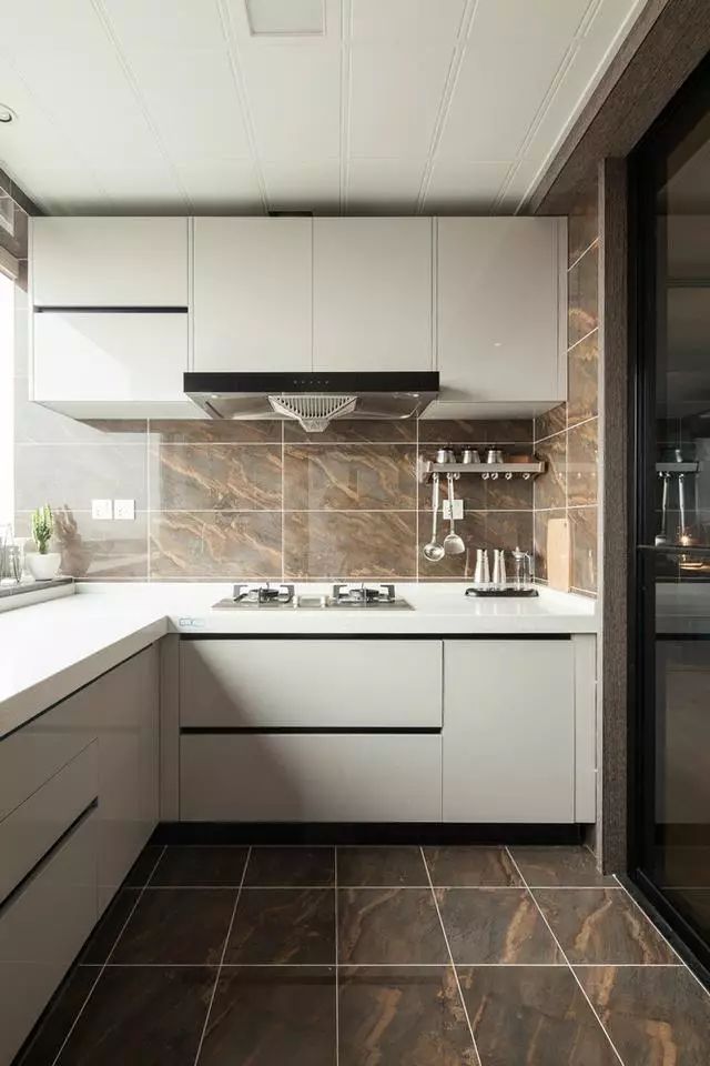 厨房,白色的石英石操作台及白色的烤漆橱柜,墙面是与地面铺贴同款式的大理石瓷砖。