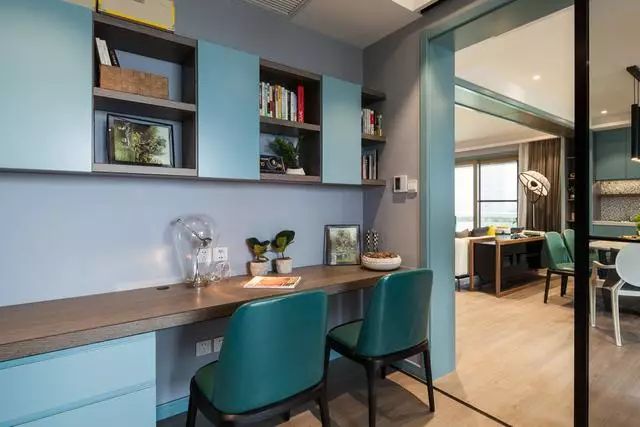 书房,色调同样还是延续了蓝色,由浅到深,看起来更有层次。