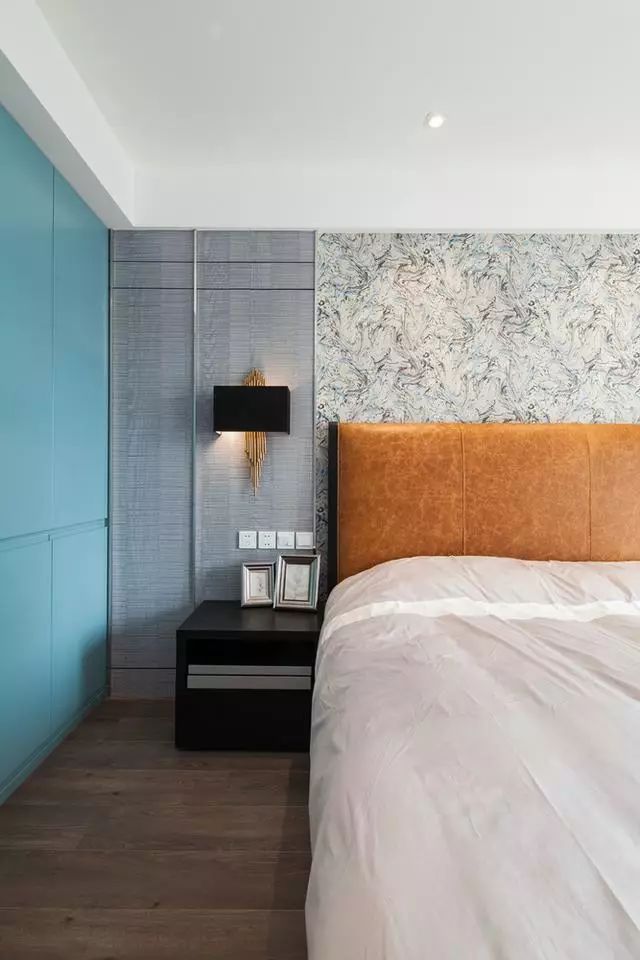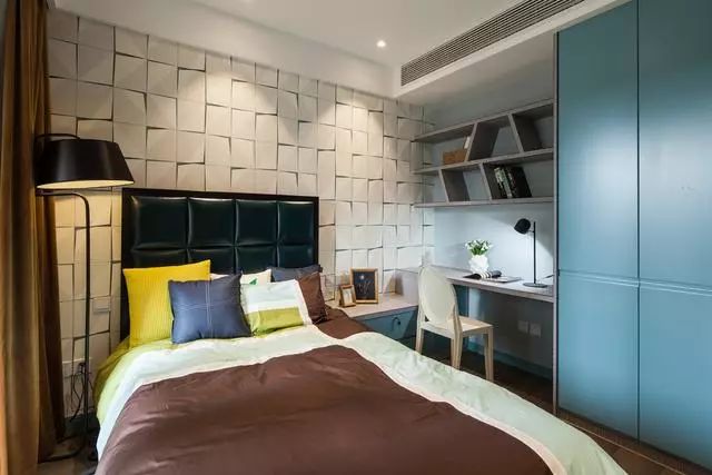 次卧,床头背景同样是采用3D感很强的壁纸,衣柜与书柜结合设计,更省空间也更加实用;