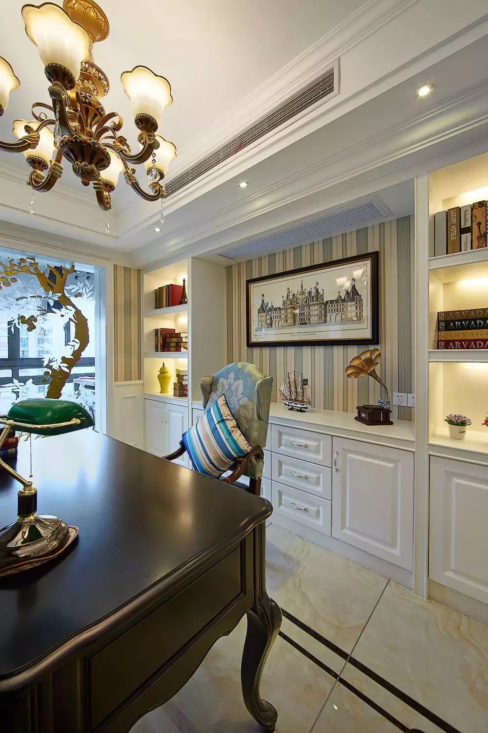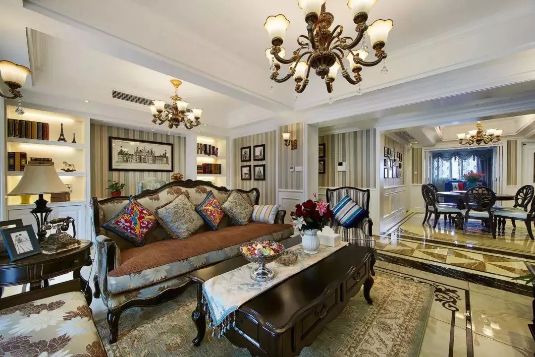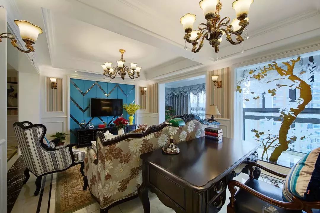 客厅和餐厅、书房都做了开放式的布局,可以显得空间更加宽敞,软装古典的花纹更是增加了贵气。