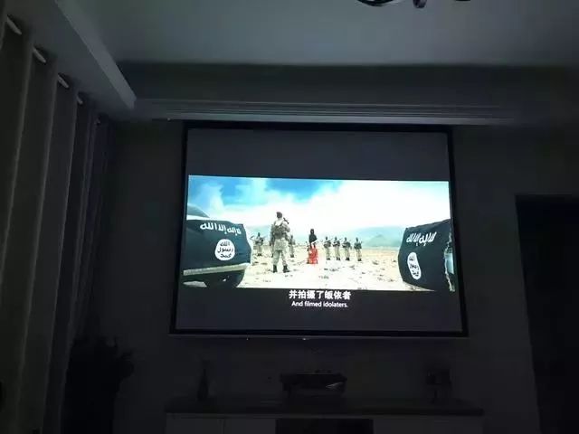 电视背景墙很简洁,直接放了投影仪。投影仪不用的时候可以收上去,幕布后面是电视。