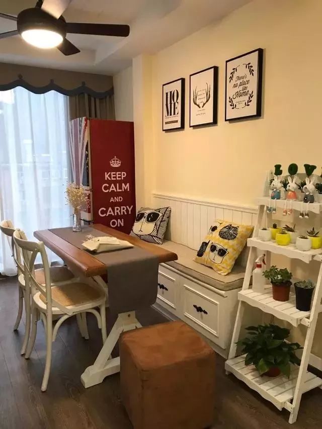 餐厅使用了时下比较流行的卡座,既节省空间又增加储物。制作木架来摆放绿植,更增添了一点田园气息。
