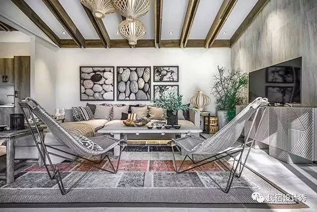 家具选型上大胆选用了型态松软的布艺沙发与藤编艺术手工家具,局部点缀大化风的老木头家具,为室内空间带来更为淳朴的氛围,大量的天然装饰让人有一种置身于自然的恍惚感。大规格的鹅卵石挂画是设计的主题亮点,搭配珊瑚树绿植给予了整个空间无限的生命气息。