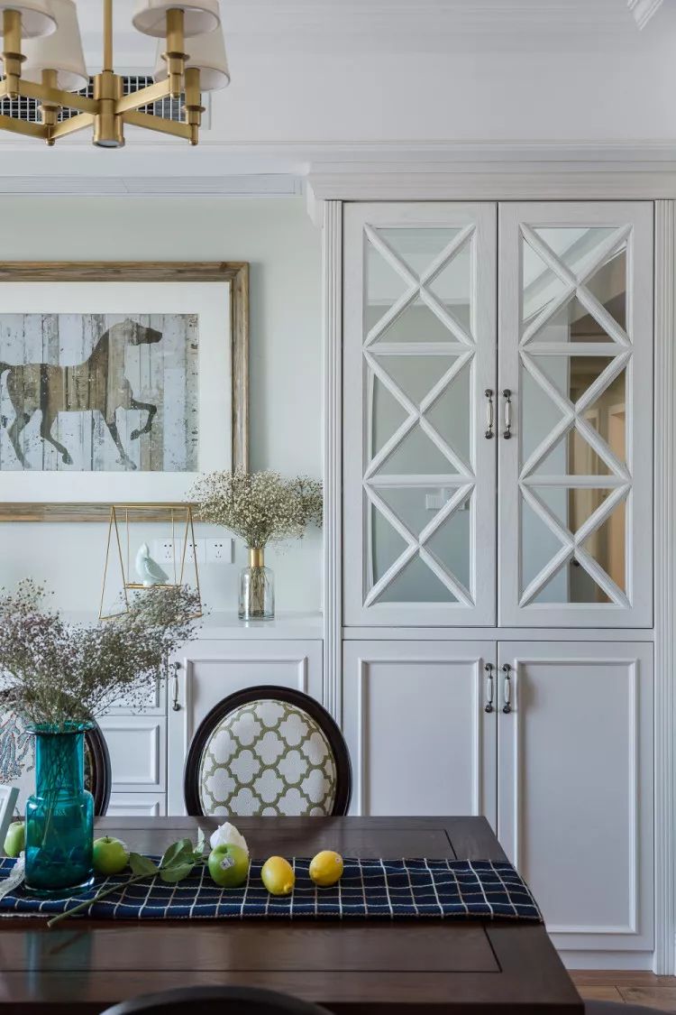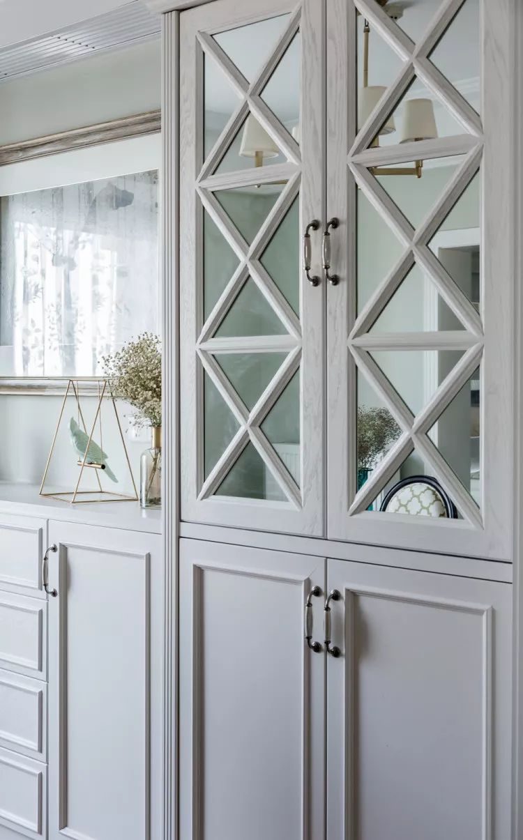 酒柜细节,乳白色的酒柜简洁明快,镜面的柜子,视觉上拉伸纵深感。