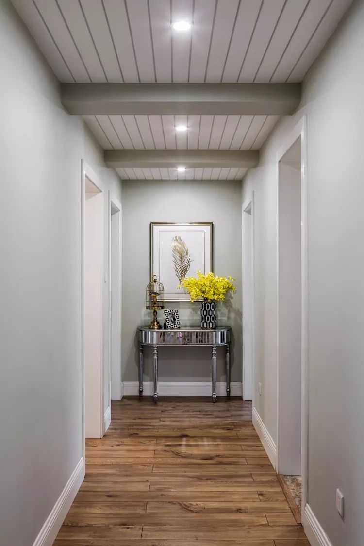 从客厅到卧室的过道尽头,一组简美样式的玄关台,搭配留白为主的装饰画,银色和香槟色构成视觉的主体色,增添的黑白相框和花瓶让展台变得时尚摩登。