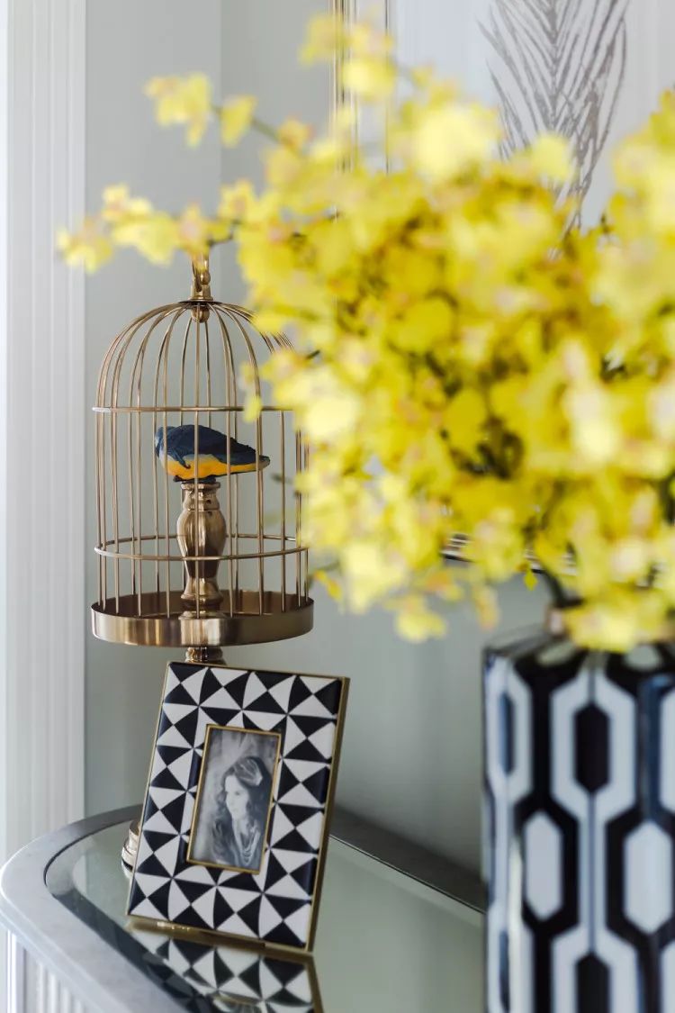 一抹蝴蝶兰画龙点睛,让空间焦点活跃起来,铜质的鸟笼装饰与羽毛画的形态平衡呼应,和谐美妙。