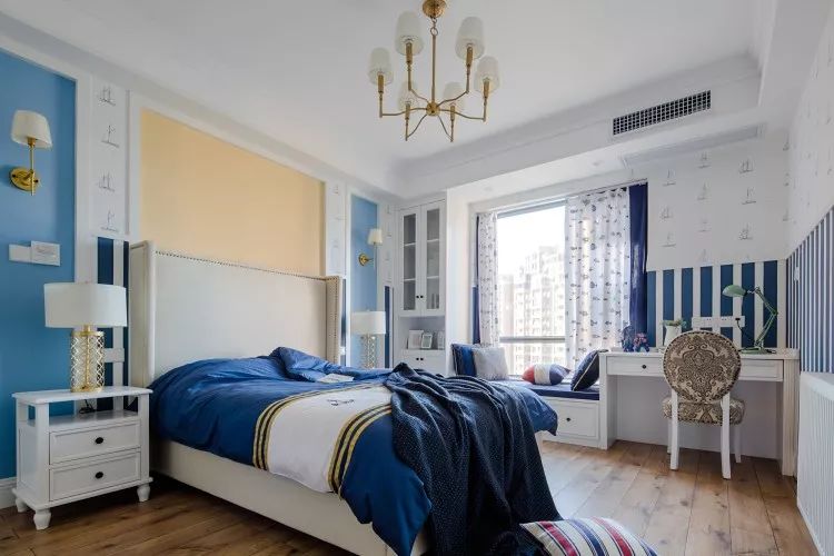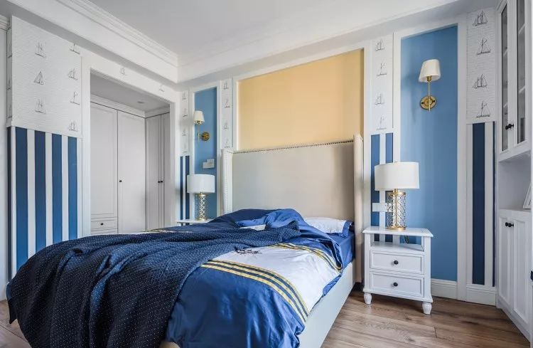 男孩房进门左边一组多功能柜,适合书籍、玩具的收放。男孩房的蓝色,来自海洋的颜色,是不是唤醒了每一个男孩的航海梦呢?