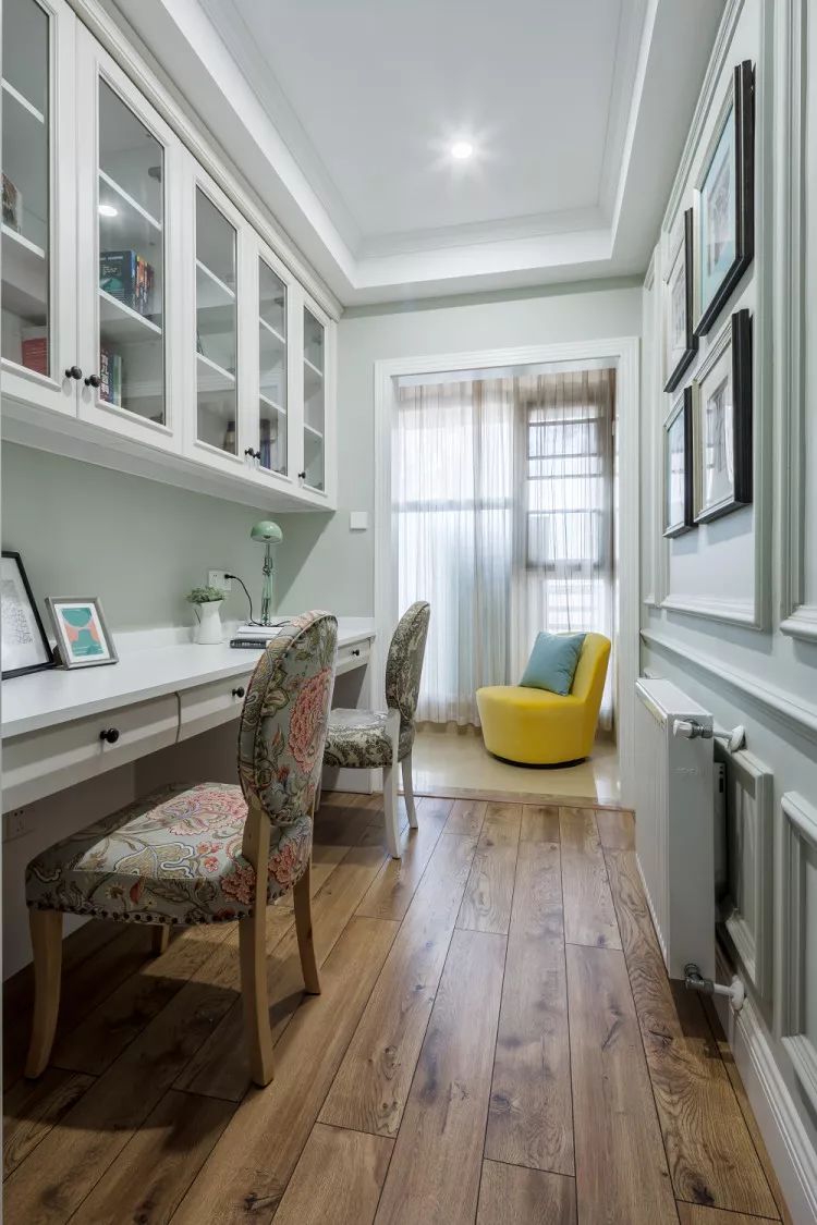 书房空间狭长,采用靠墙设计整排的书桌,在安静的环境里享受阅读的乐趣,在暖黄的休闲椅上休息,舒适而自在的享受着生活的每个细节。