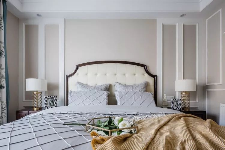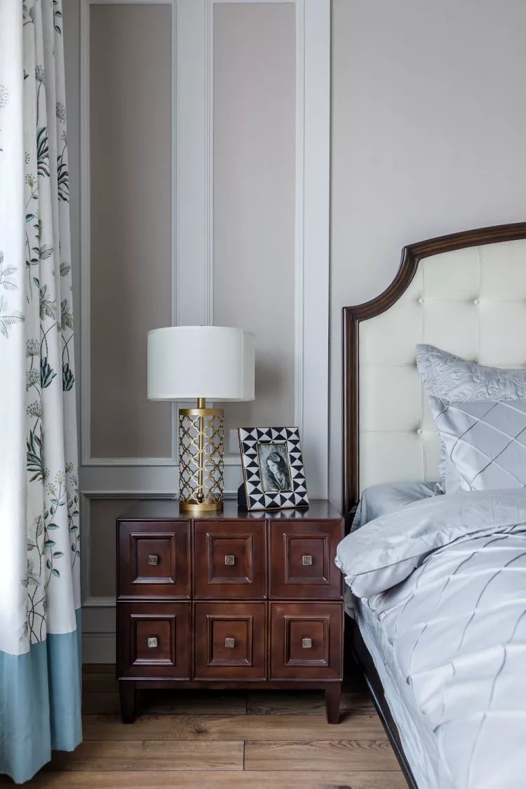 床头柜样式与客厅沙发墙气质相当,区别在于复古沉稳的色调,更适合舒适睡眠的氛围。