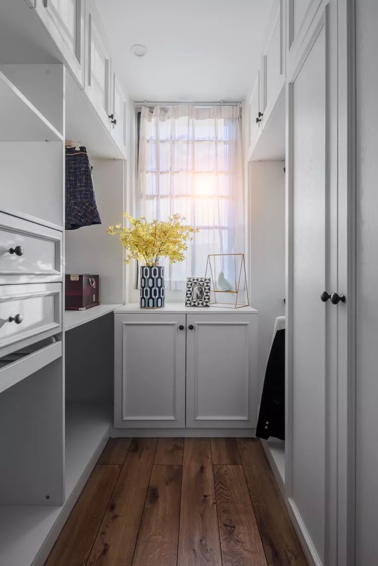 主卫同样做了干湿分离,出入主卧的衣帽间也更加方便。衣帽间面积有限,用白色调弥补空间的狭小。
