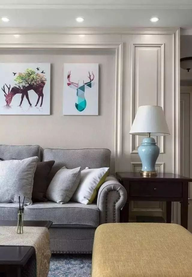 沙发墙是典型的美式风格墙面,边几上的一盏台灯,巧妙地述说着客厅色调。