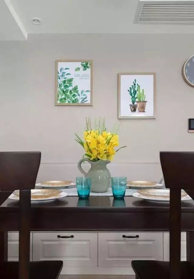 餐桌椅颜色和客厅柜子保持一致,墙面的挂画,清新自然好舒适。