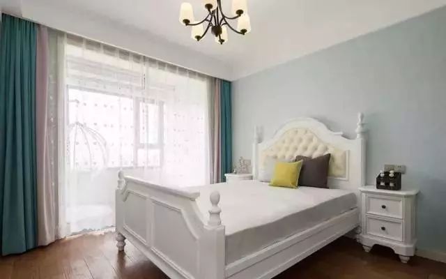 主卧室色调清新,淡蓝色墙面搭配白色床,粉+蓝拼接窗帘搭配了蕾丝纱帘,梦幻甜美。