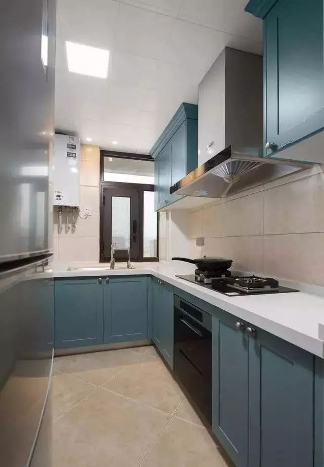 厨房蓝色柜门+白色大理石台面,简洁明快而又复古,不需要太多设计,用起来方便舒适最重要。