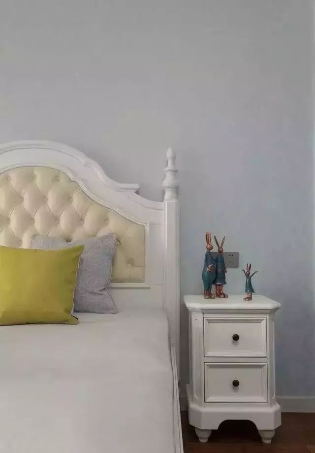 床头柜小巧精致,兔爸、兔妈、兔娃的摆件,洋溢着幸福。
