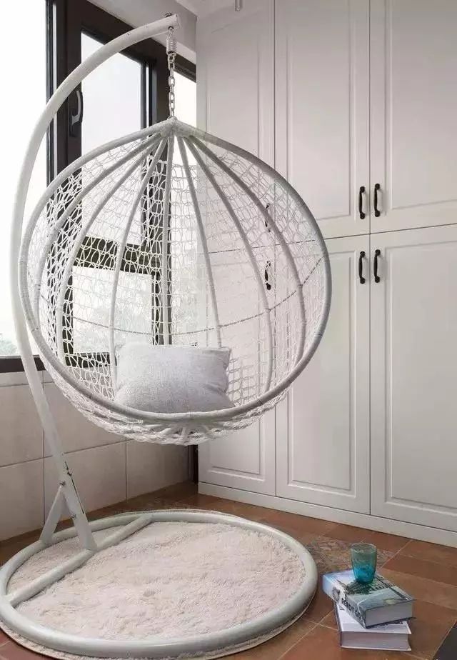 阳台的空间收进室内,在两侧打上收纳柜。下雨天,窝在吊篮里,看一本或是静静听雨声,都是十分放松的惬意。