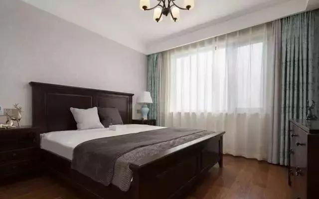 爸妈的房间,色调素雅沉稳,浅粉色+浅绿色的拼接窗帘,平衡空间色彩。