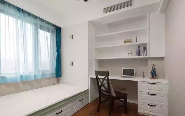 小书房定制了榻榻米连柜,床不是很大,把更多空间留给了书桌、书架。