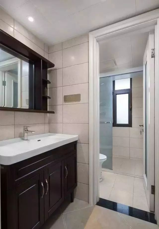 卫生间把洗漱台放在门外,室内分成淋浴间和马桶区,舒适宽敞。