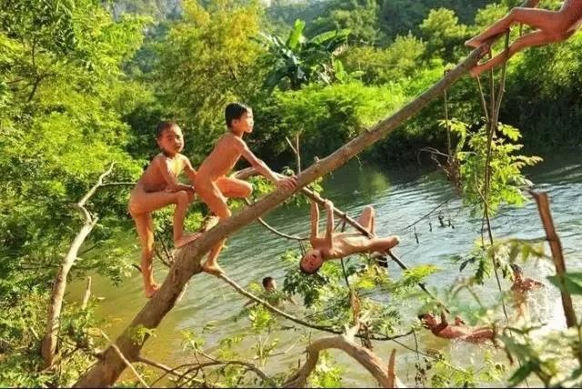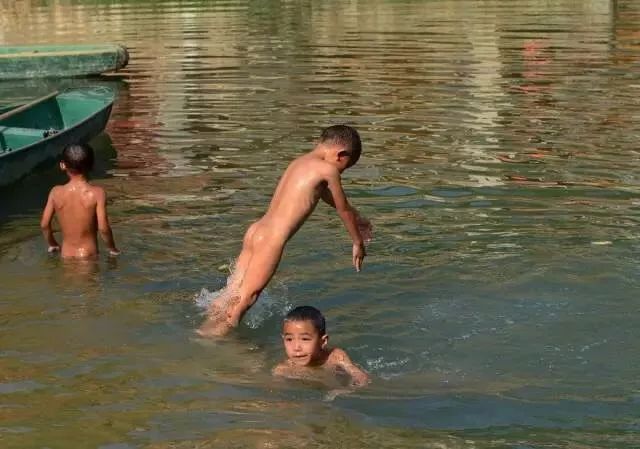 孩子们赤身裸体在水里玩耍