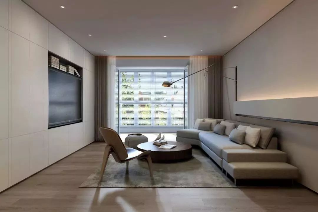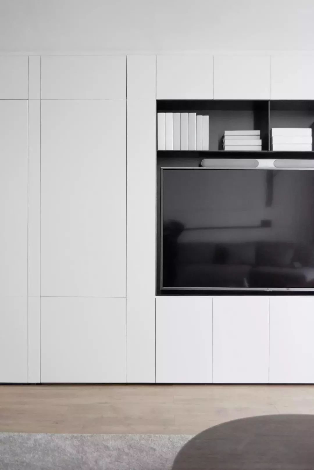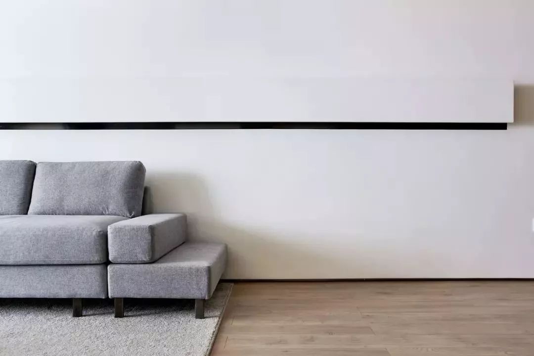 入墙的整体式电视组合柜,流动的黑色线条,营造空间设计感,简约流畅而又不失张力。同时电视墙上也藏了很多隐藏式的收纳柜,为这个极简的空间提供了丰富的储物空间。