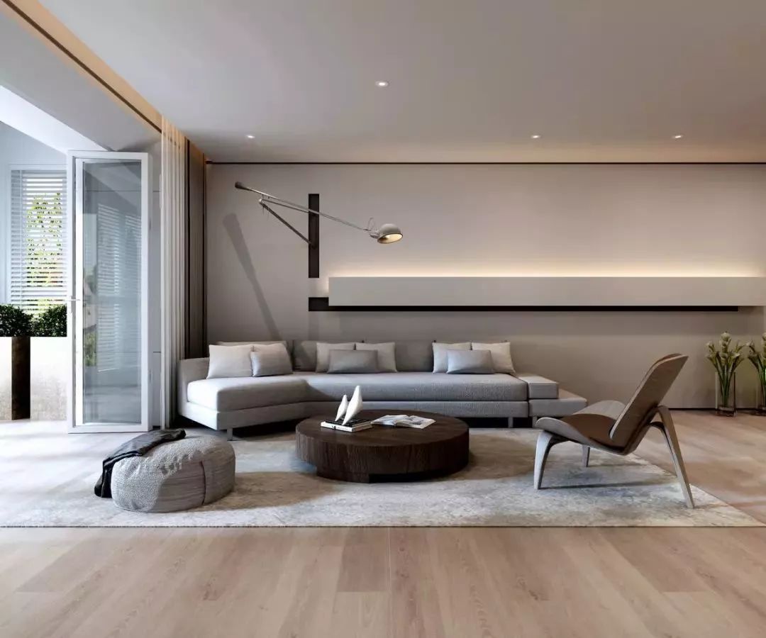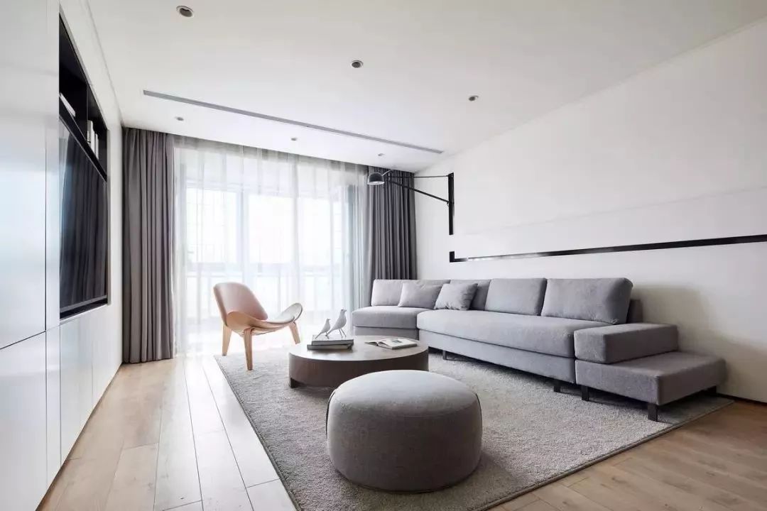 圆形的布艺坐垫,造型与质感都与这个极简的空间很搭配,沙发墙后的线条造型与壁灯连贯一体,形成一条独特的美感线条。
