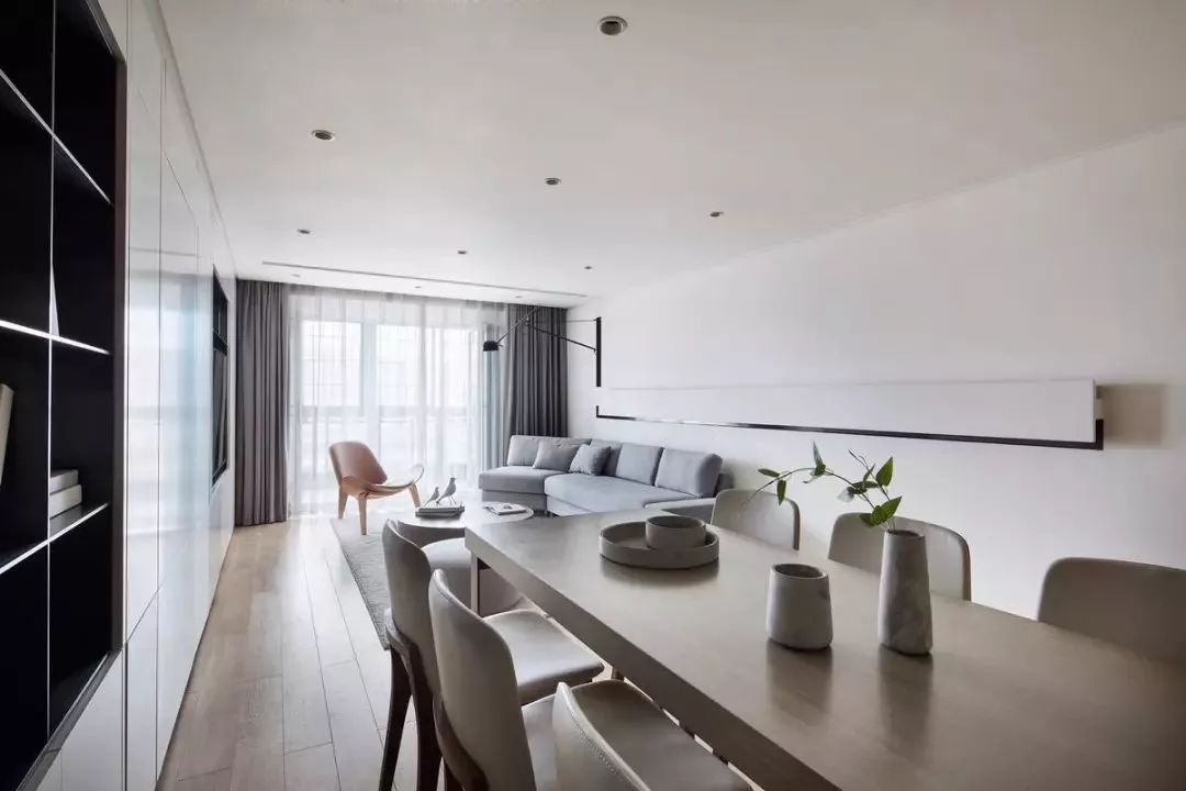 以墙面的储物区分客厅与餐厅的空间,简单明了,还省去了隔断搭配的困扰。在大片白色的柜门基础,客餐厅区域都留了一个黑色的展示架/电视机,整体简洁而又时尚的视觉感。