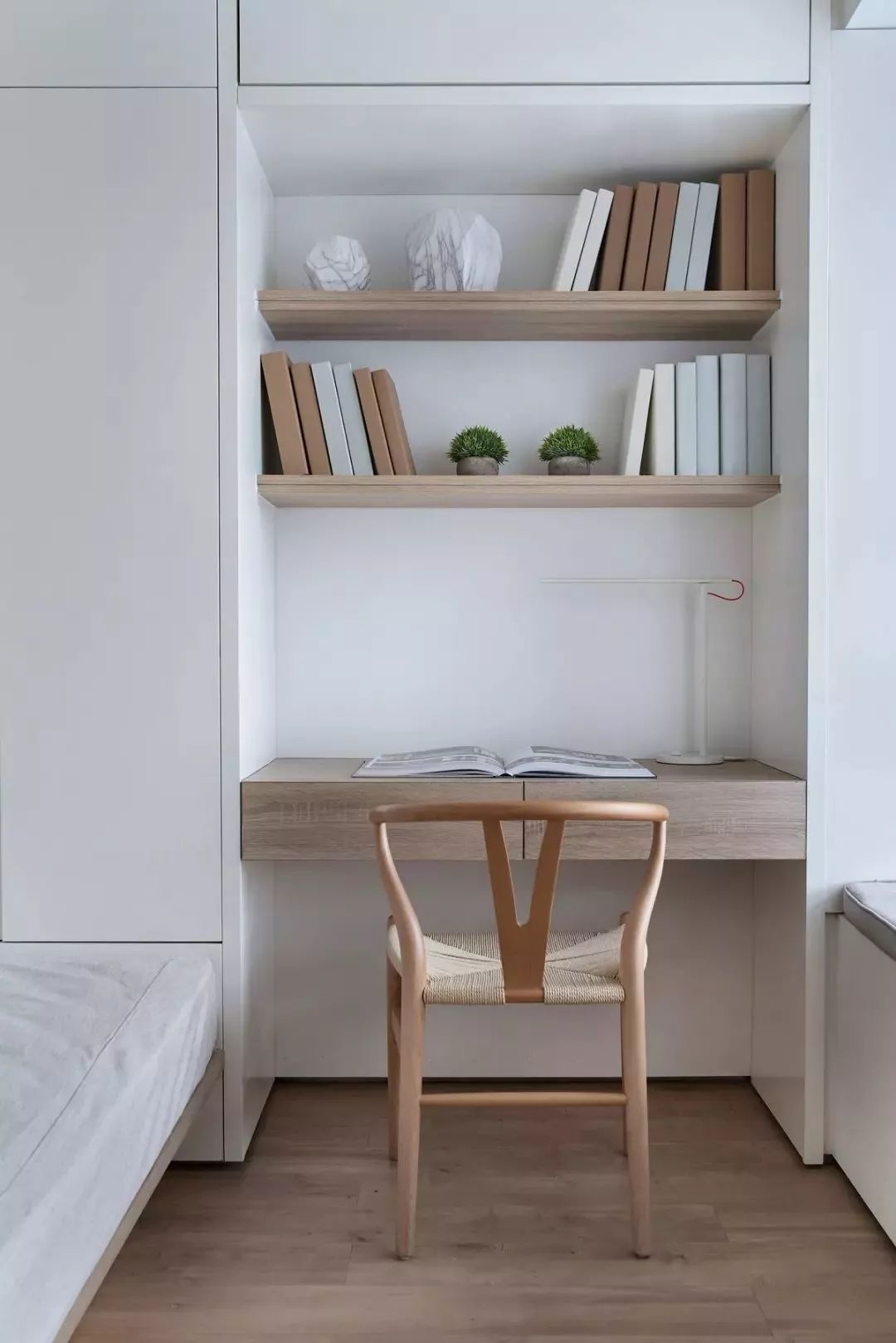 文艺白的网格铁艺椅子和一体式书桌作为卧室的一角,书架上布满了各类书籍,给人一种文艺干净的视觉效果。
