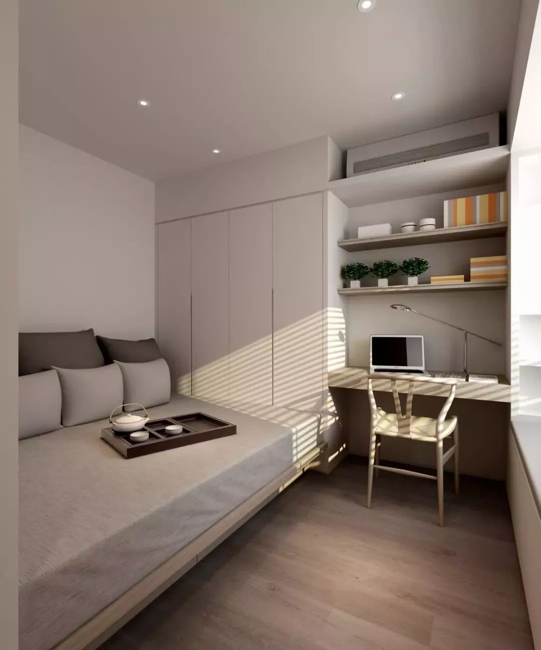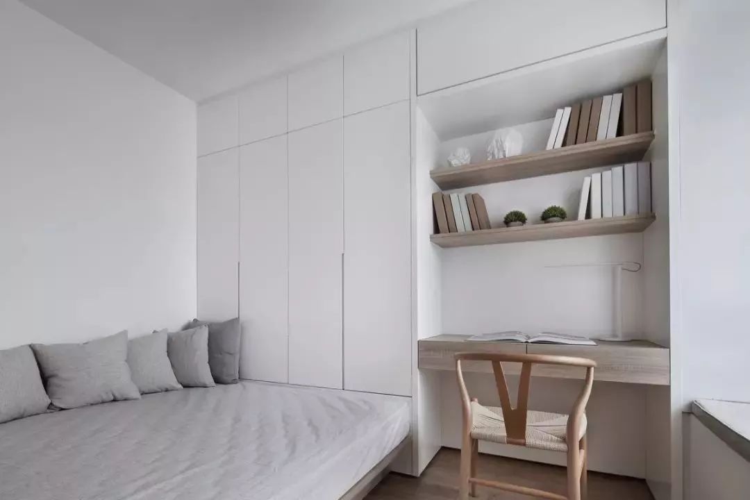 这个书房融入了书桌、收纳与客房功能。黄昏时分,工作结束,泡上一壶香茗,背靠抱枕,茶香入鼻,闭目养神,片刻,端起茶杯,小品一口,回味无穷。