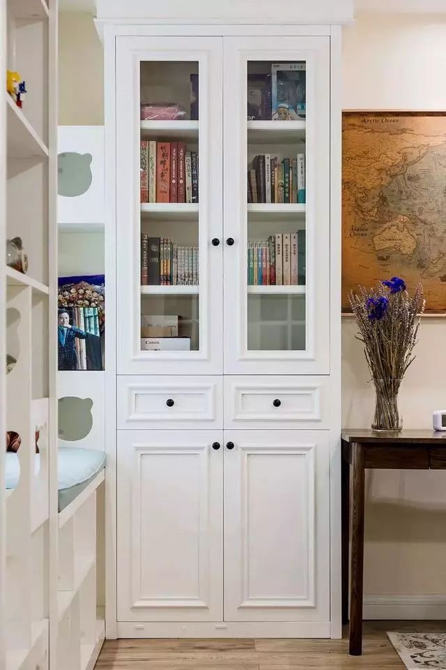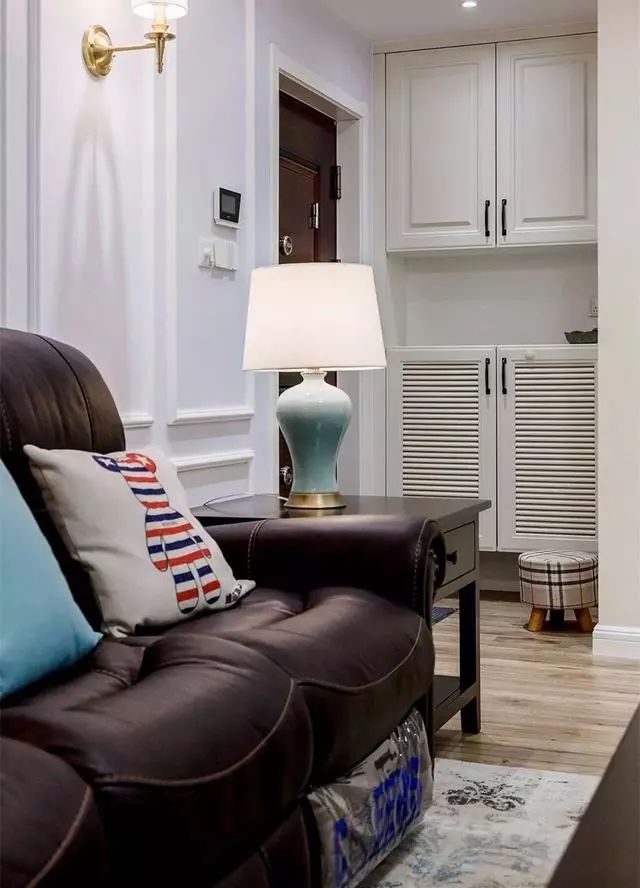 即使是一个很小的空间也能满足家人日常鞋子的更换收纳,而且这个白色鞋柜的门做成百叶型的更时尚哦~中间部分留空,可以放置一些随手拿取的小物件~也为了让换鞋变得更舒适,这里准备了一把小小矮凳。