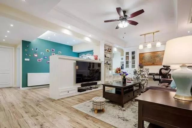 然后这个客厅的空间会比较大一点,所以将书房也设计在此。满满美式风的真皮沙发坐着一定很舒适。不过,这里小编最想说的其实是这个电视背景墙的设计。