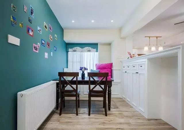 然后当我们看到这个餐厅的时候,可以看到原来客厅的电视背景墙的后面还设有收纳柜,这样一个客厅电视柜就不单单只是一个电视柜,而且还是餐厅的一个餐边收纳柜,也是一个时尚的家居吧台,更是客厅与餐厅的一个巧妙隔断。而小编认为,客厅与餐厅的这个多功能隔断设计还是挺有参考意义的,值得借鉴!