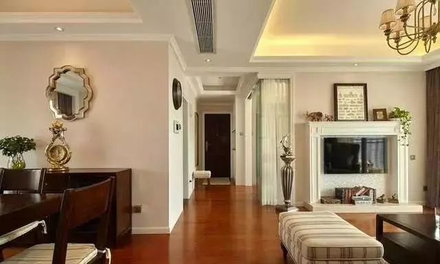 玄关,进门左手定制了一面入墙的分体鞋柜,中间留空,便于置物。进门右边墙面悬挂穿衣镜,设置了换鞋凳。原始门厅过道原本与书房以实体墙隔开,导致门厅采光不太好,所以设计师将书房隔墙改为玻璃隔断移门,加上纯色的棉麻质窗纱,既能体现美式风格的自由随意,又能让门厅显得更大气通透。