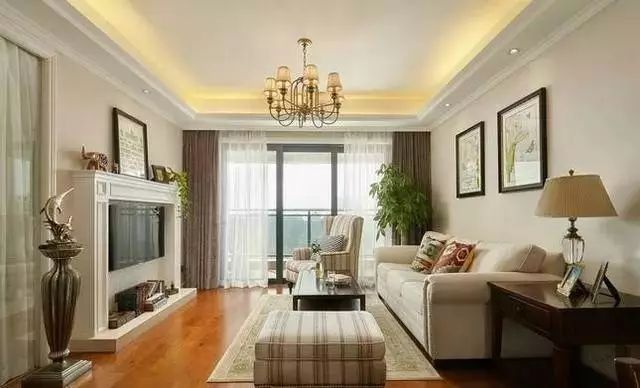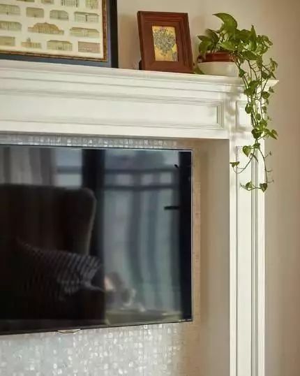 电视背景墙设计成壁炉造型,加上凹位内闪亮的贝壳马赛克点缀,赋予整个空间精致自然之感。壁炉上方摆放小巧精致的摆件和绿萝,营造休闲美式的氛围。