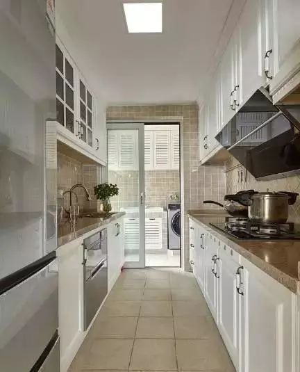 厨房,空间比较狭长,与生活阳台连通后,光线和通风效果上都有改善。地面铺设复古风的瓷砖,搭配白色橱柜,预留冰箱的位置,让空间动线流畅。