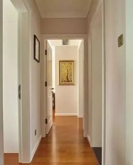 过道端景,在过道尽头墙面悬挂了一幅金色镶边的抽象艺术挂画,美化了空间,让过道显得精致而深远。