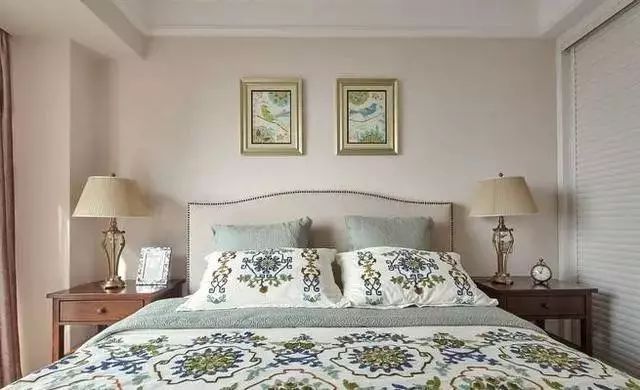 大面积的浅色墙面和床品,于淡雅间给予人以安心,让人的内心瞬间平静下来。床头背景墙再点缀上装饰画,一对复古铁艺床头灯,让空间多了几分雅致。