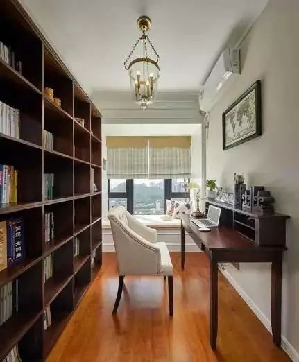 书房,奶咖色乳胶漆墙面搭配深咖啡色的书桌、书柜,尽显视线的静默与深沉。开放式书架墙提供强大的藏书功能,一盏创意金属质感复古吊灯,带来更多柔润的元素,显得轻盈放松。