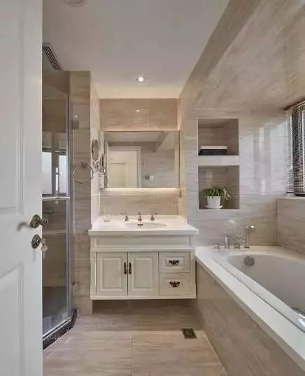 卫生间,地面与墙面通铺仿石纹瓷砖,散发温润的光泽。乳白色的洗手台橱柜,加装隐形灯带的镜面,现代感的空间内既有浴缸又有淋浴房,功能十分齐全。