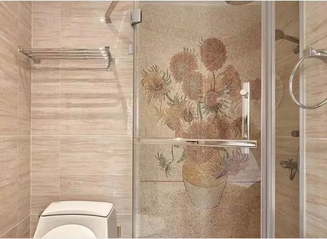 淋浴房内墙面做了向日葵马赛克拼花,既装饰了空间,又给卫生间带来了别致的品味,极具优雅和浪漫。